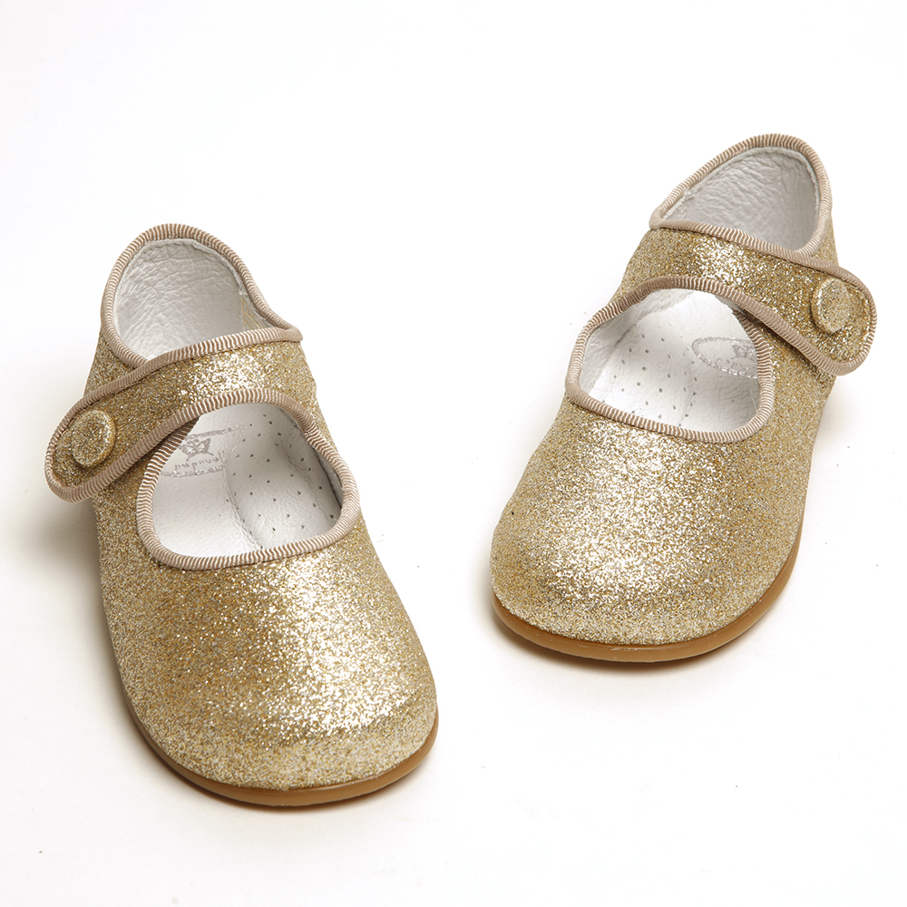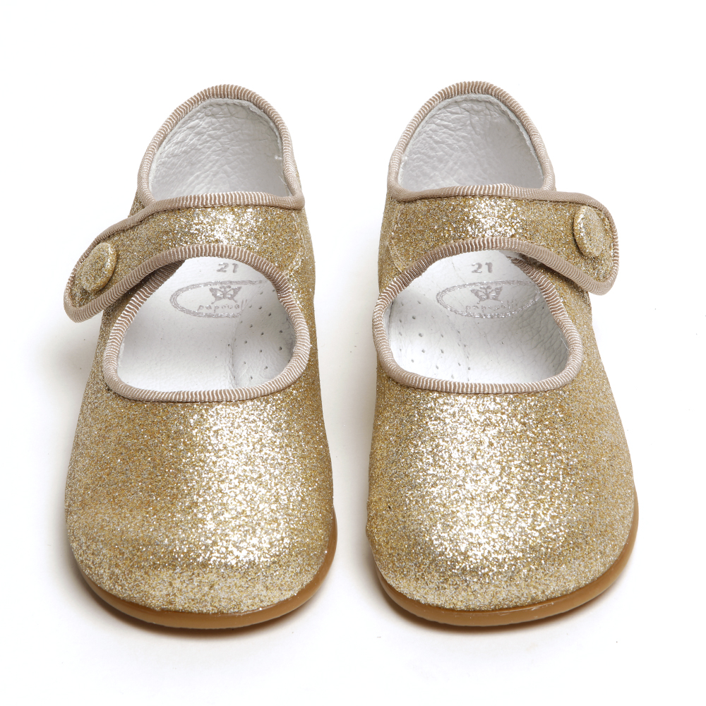 Our best-selling strap shoe Catalina comes in two glitter versions. Choose from bright gold or old gold. Discreet velcro strap fitting and flexible sole, this shoe will give sparkle to any outfit.