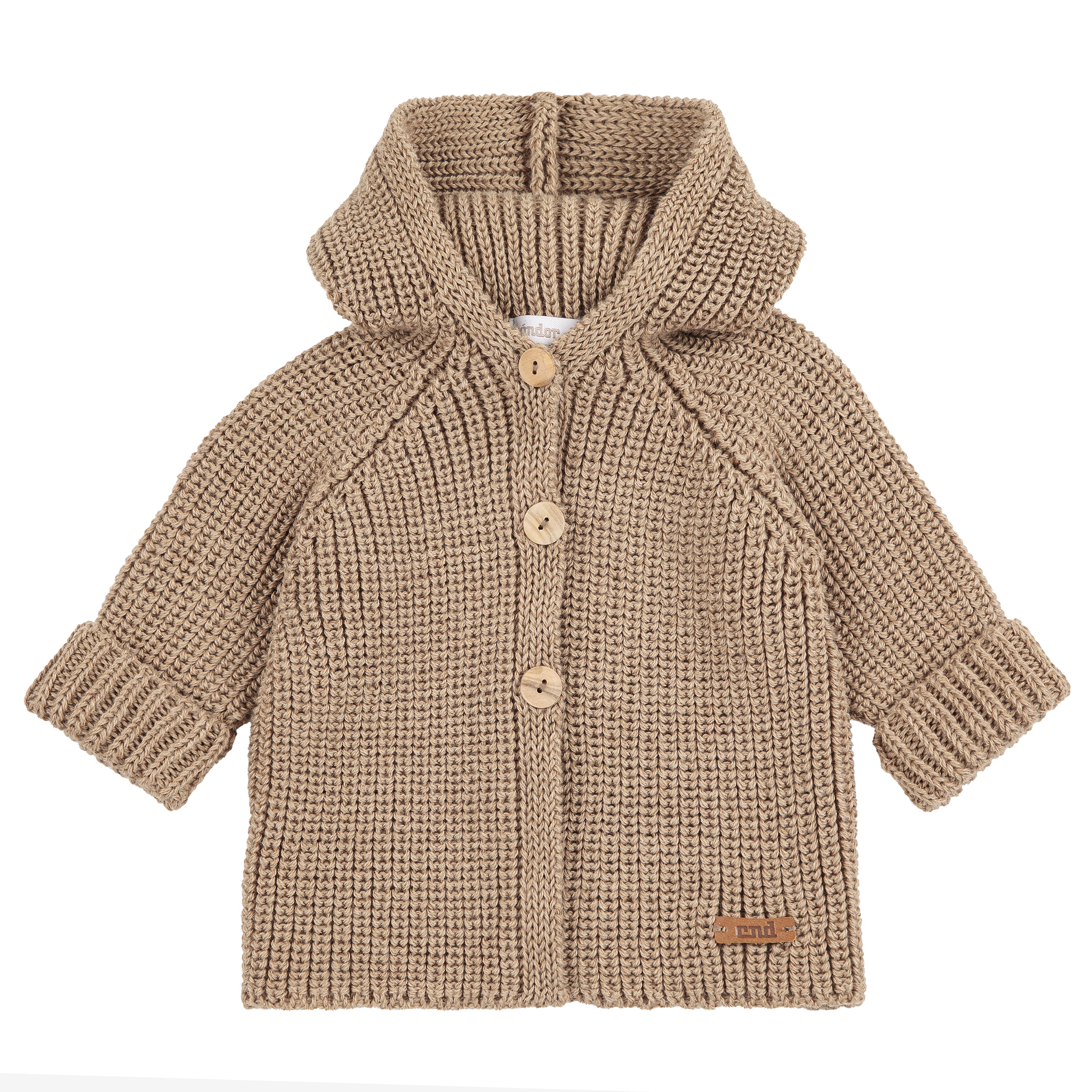 This hooded cardigan is a perfect everyday jacket for both boys and girls. Add some cord bloomers and little shoes or boots to finish the outfit. 50% wool, 50% synthetic. Comes in navy and beige.
