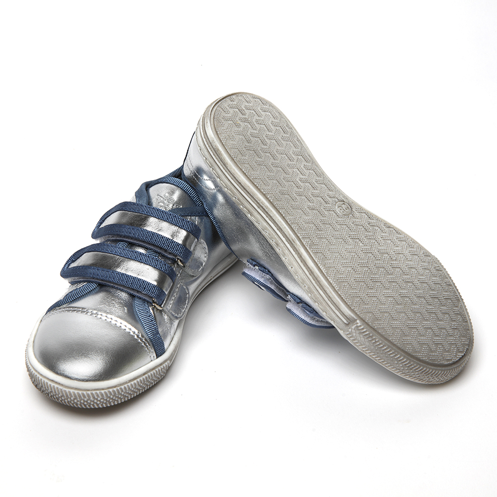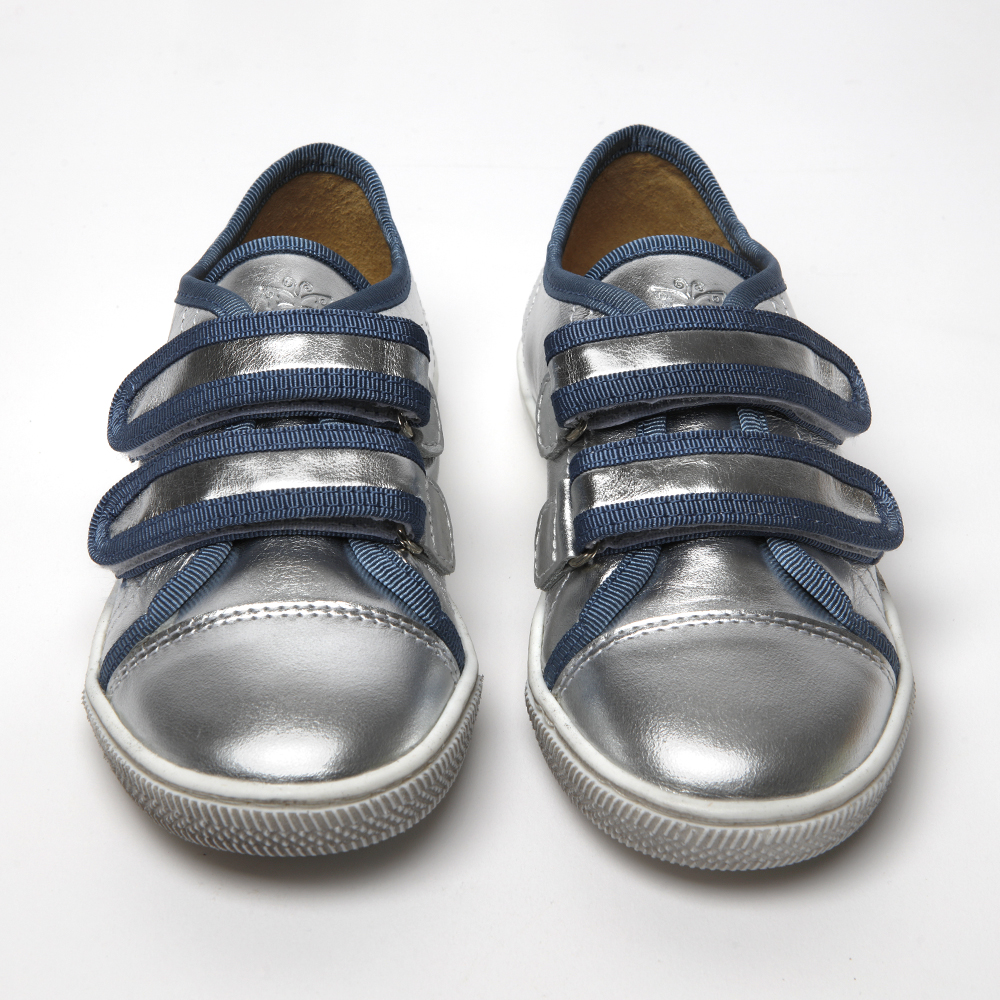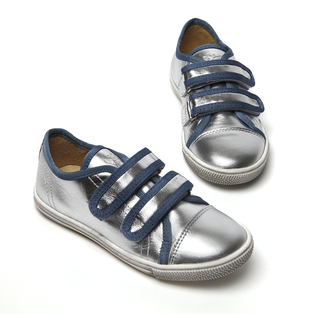 This is a fun version of our beloved Elfie velcro trainers. With blue or yellow grosgrain trims on a distressed white sole, these sneakers are perfect to step into a new season with.