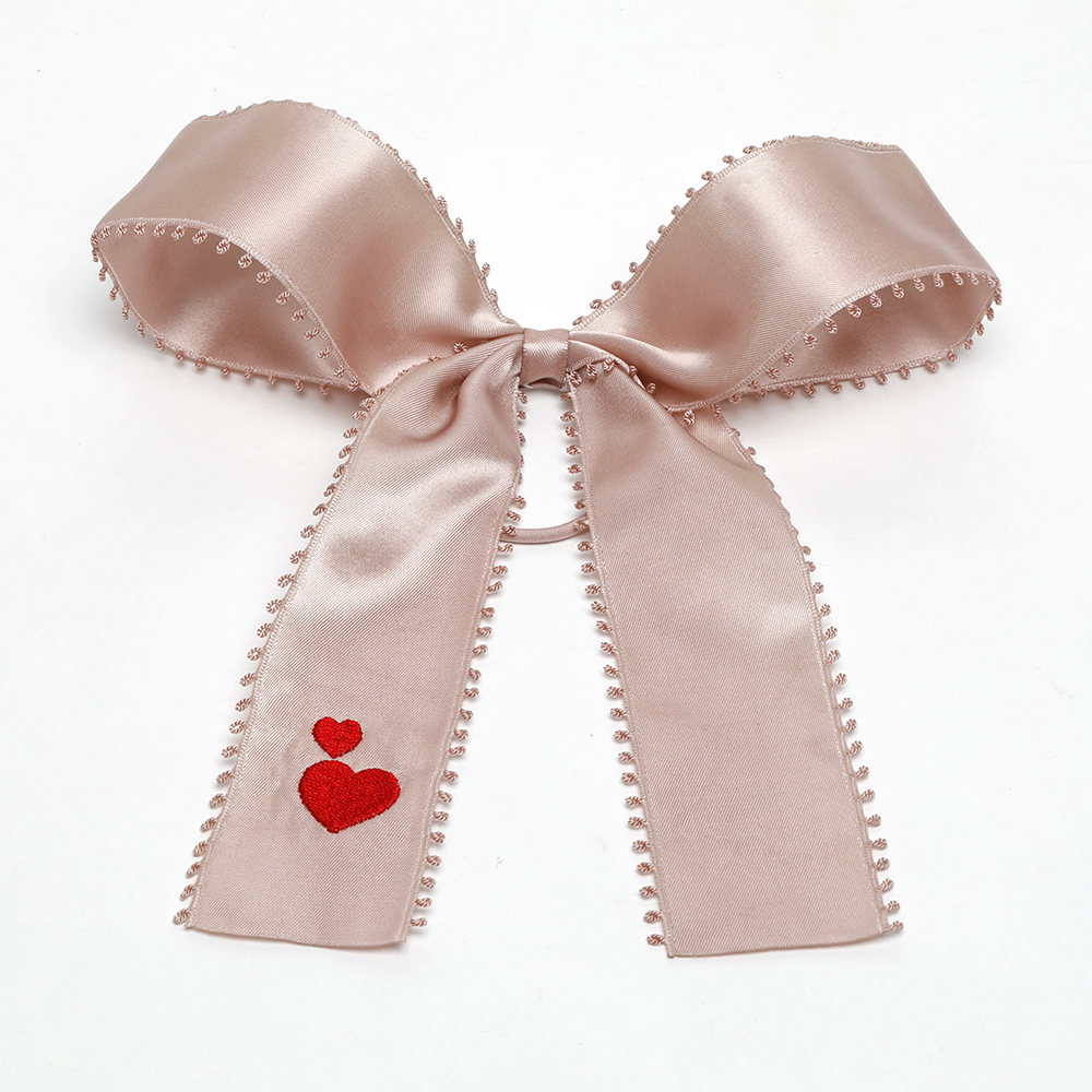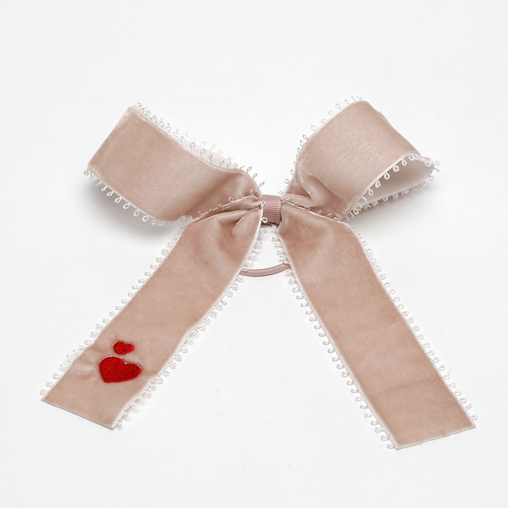 A lovely pink satin or velvet hairbow on elastic with embroidered red hearts will look pretty in February, but actually anytime of the year.