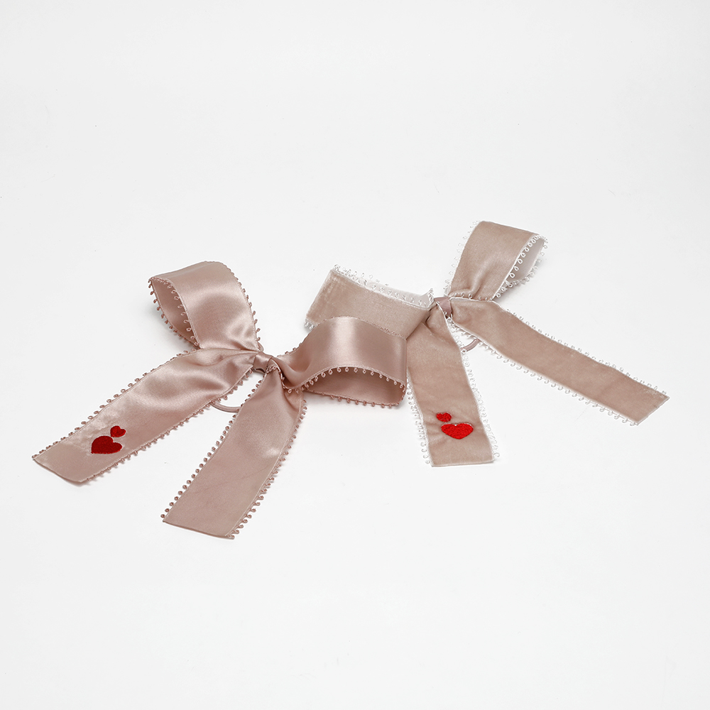 pink satin bow with red hearts, pink velvet bow with red heart